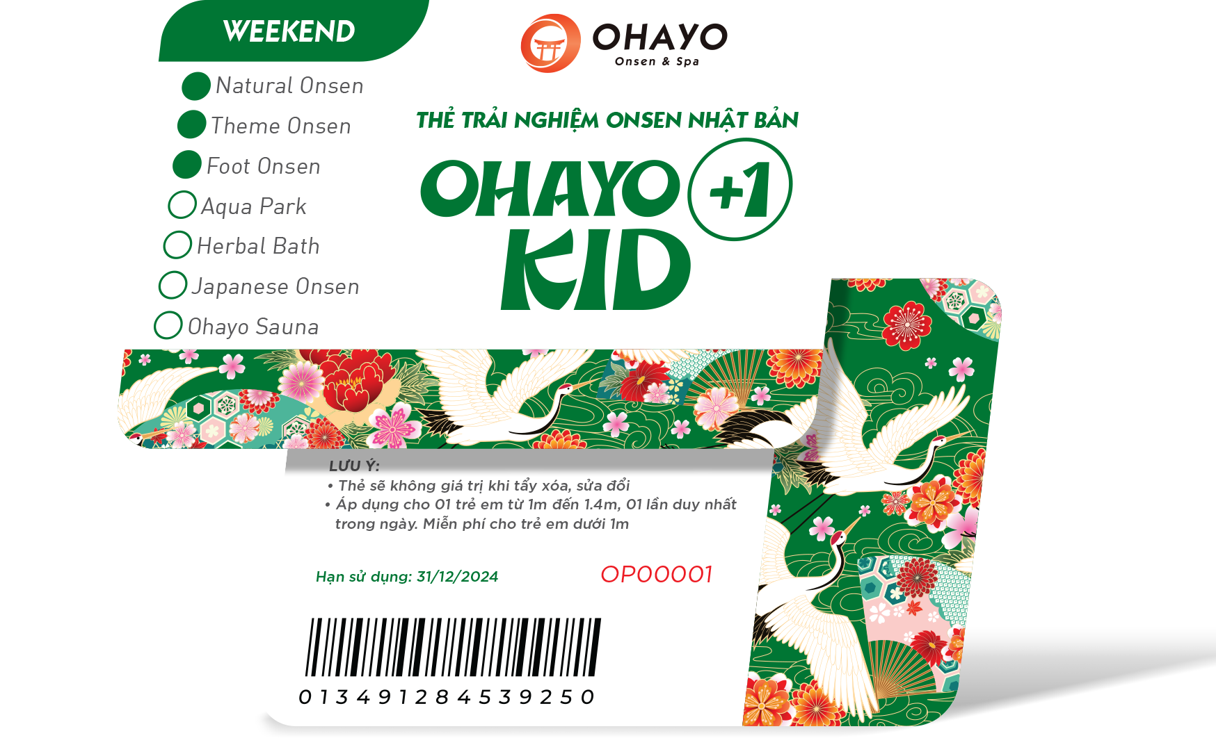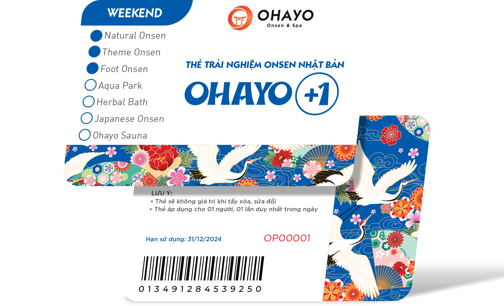 Thẻ trải nghiệm dành cho cá nhân trải nghiệm công viên khoáng nóng Ohayo Onsen & Spa trong ngày với các dịch vụ tặng kèm hấp dẫn.
